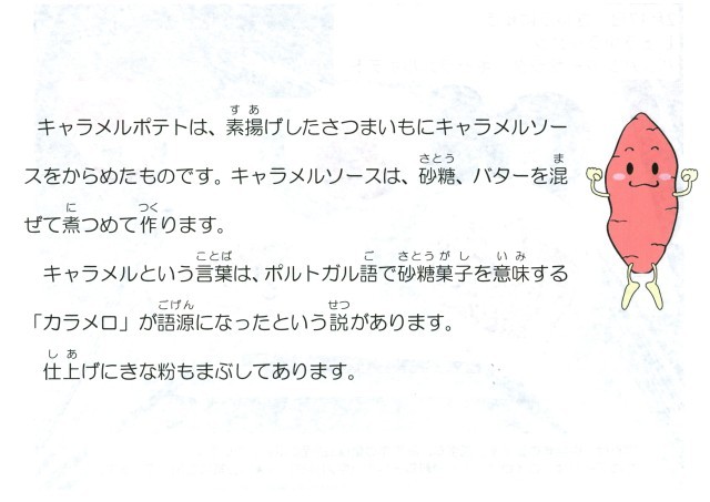 キャラメルポテトは、砂糖にバターを混ぜて煮詰めたカラメルソースを素揚げしたさつまいもにからめるだけではなく、仕上げにきな粉をまぶしているのです。食べた瞬間に、「あっ、これはきな粉だ。」と、おおきなこえで叫びそうになりました。