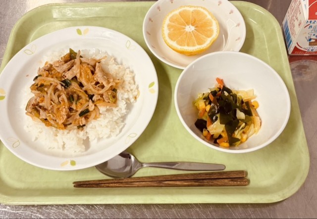 今日は、豚キムチ丼、わかめサラダ、果物(柑橘)、牛乳です。