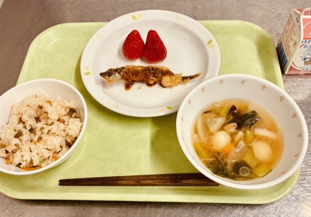 今日は、豚肉とごぼうのご飯、ししゃものフライ、芋団子汁、果物(いちご)、牛乳です。