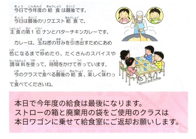 今年度最後の給食は、リクエスト給食主食第1位です。今日の主食は何なのか、ナンですね。何となく気がついていました。