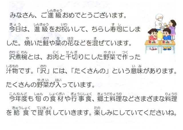 今日は、「進級お祝い」ということで、鮭ちらし寿司です。進級して、新旧の教室が変わっているところがあるので、間違えないようにしましょう。