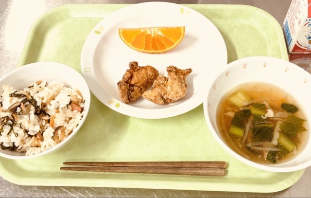 今日は、鮭ちらし寿司、鶏のから揚げ、沢煮椀、果物(柑橘)、牛乳です。