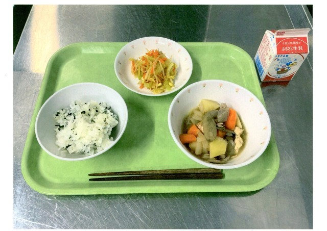 今日は、わかめご飯、五目味噌煮、じゃこの和風サラダ、牛乳です。