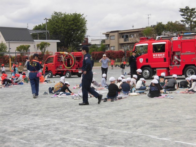 4月15日に1年生が消防写生会を行いました。消防署から消防士さんをお招きして、校庭で消防車の絵を描いていました。