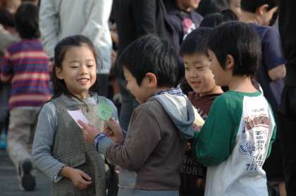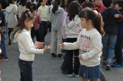 今日の児童集会は名刺交換ゲームでした。それぞれの学年色の名刺を用意し、じゃんけんで勝つと相手の名刺をもらえるという簡単なゲームです。それでも900人の子どもたちが一斉にやると、大変なにぎわいです。あちらこちらで歓声が上がっていました。