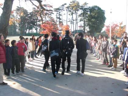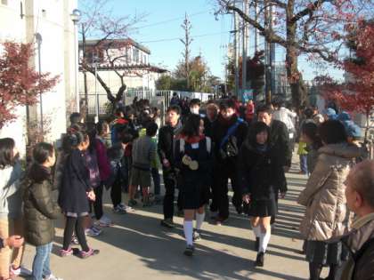 今年一番の冷え込みのあった朝、霜柱まで立っていた今日、学び舎あいさつデーでした。今回も1学期に続き、山野小、明正小、砧小の子どもたちが砧中に行き、登校してくる中学生にあいさつをする設定です。山野小では、5,6年生の希望者が殺到し、じゃんけんなどでメンバーを絞っての参加となりました。かわいい後輩たちのあいさつを聞いて、砧中の先輩たちはどんな思いだったでしょう。きっと気持ちの良い一日のスタートを切れたのではないでしょうか?