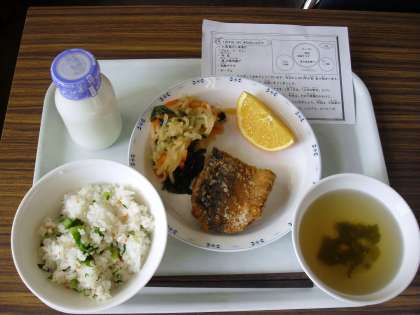 今日は、七草風だし茶漬け、牛乳、魚の竜田揚げ、和風サラダ、ネーブルです。