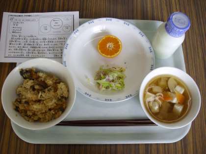 今日は、さんまごはん、牛乳、ゆかりかけ、けんちん汁、菊花みかんです。