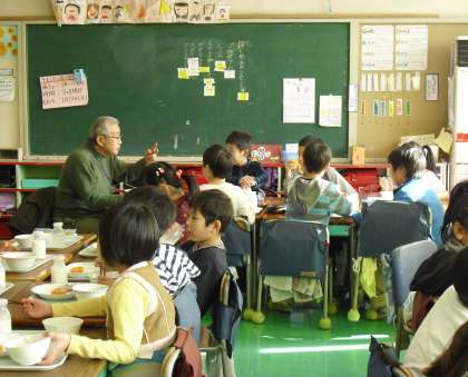 今日は、2年生が地域の方に昔遊びを教えていただき、給食も一緒に食べました。昔遊びはとても楽しかったようで、給食の時間もその話で盛り上がりました。