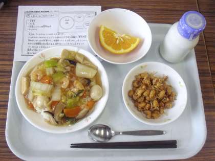 今日は、中華丼、牛乳、大豆とじゃこの甘辛あげ、いよかんです。