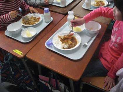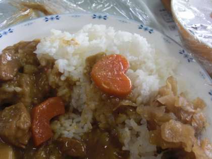 今日の給食献立は、カレーライスとサラダ 等々。