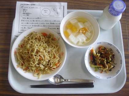 今日は、塩焼きそば、牛乳、野菜の塩昆布かけ、フルーツ杏仁です。