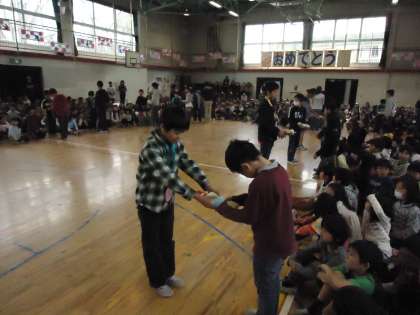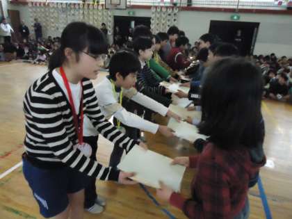 6年生は最後に全員合唱を披露してくれました。「ふるさと」という曲でした。あの有名な「うさぎ追いし・・・・」ではなくて、今年のNHKの合唱コンクールの課題曲になっている曲です。とってもいい歌で、6年生たちの気持ちも入っていて感動でした。6年生から在校生に台ふきと、ゲタ箱のネームプレートが送られました。また、委員会の委員長からは5年生に各委員会のファイルが手渡されました。