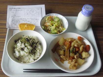 今日は、ごはん、ふりかけ、牛乳、いろどり煮、味噌ドレッシングサラダ、ネーブルです。