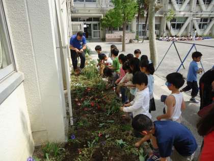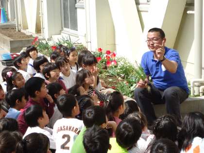 きれいに咲き誇っていたチューリップなども盛りが過ぎ、花壇の整備をしなくてはならなくなりました。球根を寄付してくださったおやじネットの方にまた来ていただき、花が咲き終わっても球根に栄養を蓄えて命はつながっていくというお話をしてもらいました。掘り上げた球根、また来年も咲くといいですね。子どもたちは一生懸命働いていました。すてきなお話し、ありがとうございました!