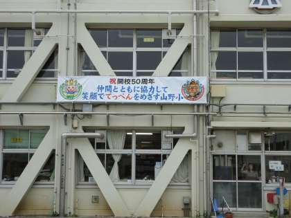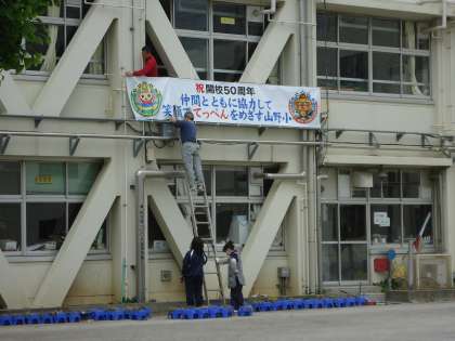 開校50周年記念横断幕を、主事さん方がとりつけてくれました。高いところの作業なので大変でしたが、無事とりつけ完了!とってもいい感じで目立っています!