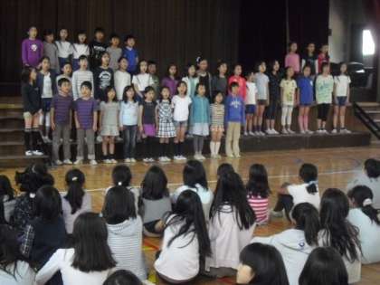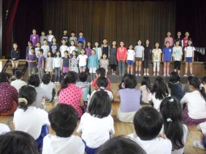 お昼休みに体育館で、山野小学校の合唱団が、コンサートを開きました。曲目は、「やあ」「校歌」「ふるさと」です。山野小学校の子どもたちの声は、澄んできれいですが、合唱団は、さすが!とってもきれいな歌声でした。体育館が、コンサート会場に早変わりしました。