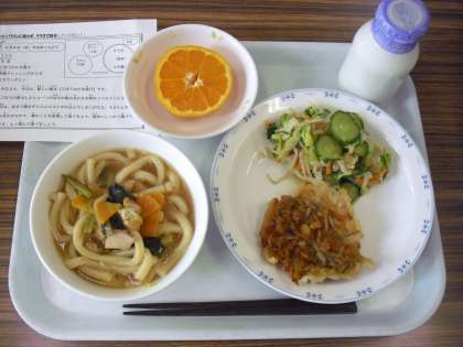 今日は、うどん、牛乳、ごぼうのかき揚げ、味噌ドレッシングサラダ、カラマンダリンです。