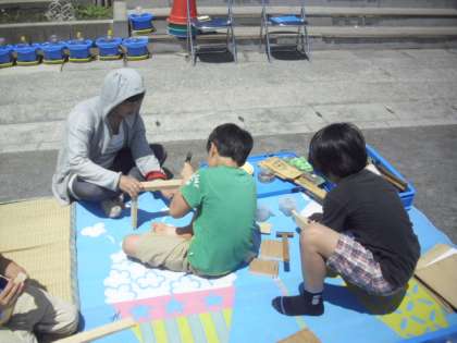 遊び場開放であおぞら木工教室が開かれていました。木を相手にのこぎりやかなづちを使って楽しく工作していました。楽しい企画を考えてくださりありがとうございます。