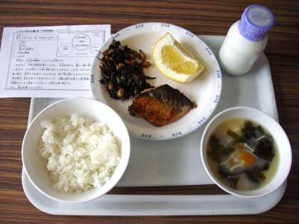 今日は、ごはん、牛乳、魚の七味焼き、大豆の磯煮、みそ汁、美生柑です。