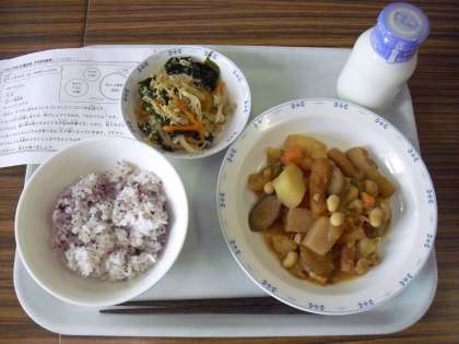 今日は、ゆかりごはん、牛乳、豆入り筑前煮、かりじゃこサラダです。