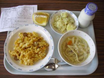 今日は、メキシカンライス、牛乳、パセリポテト、ヌードルスープです。
