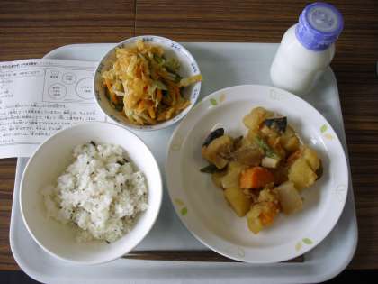 今日は、梅わかごはん、牛乳、いろどり煮、パリパリサラダ、美生柑です。