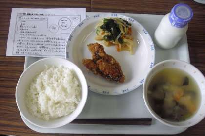 今日は、ごはん、牛乳、鯖のインディアン揚げ、和風サラダ、小松菜と豆腐のみそ汁です。
