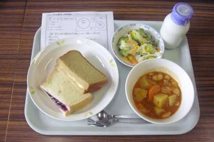 今日は、二色サンド、牛乳、キャベツサラダ、ビーンズシチューです。