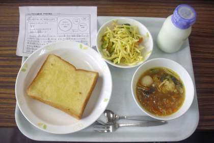 今日は、はちみつレモントースト、牛乳、じゃがいものカリカリサラダ、肉団子入り春雨サラダです。