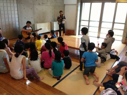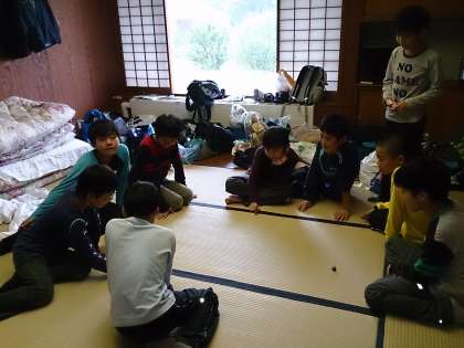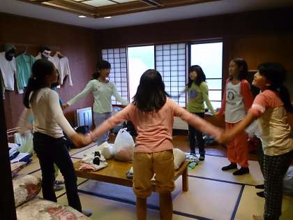 風呂上がりにリンゴジュースを飲みながら、みんなで歌ったり、部屋で思い思いにレクをしたり、みんな自由時間を楽しく過ごしています。