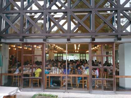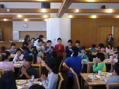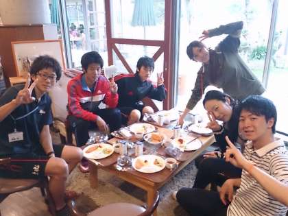 中野ビレッジ最後の食事です。山野は人数が多くて、食堂に入りきれないので、補助員さんたちはロビーで食べています。とってもがんばってくれた補助員さんたちに大感謝です。