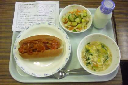 今日は、セルフチリサンド、牛乳、ポテト入りフレンチサラダ、コーンと卵のスープです。