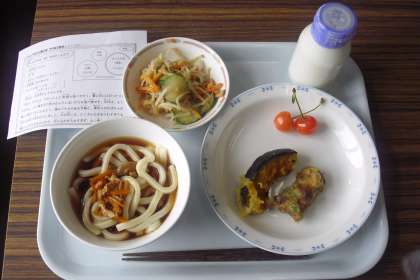 今日は、五目冷やしうどん、牛乳、てんぷら(かぼちゃ・ちくわ)、中華風ごまだれかけ、さくらんぼです。