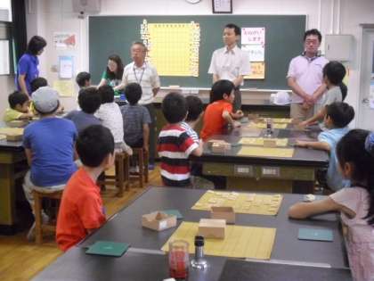 将棋教室は、今回も大人気で30名以上の棋士が集いました。でもご安心ください。今日初めての子どもも大丈夫です。初心者だけ集めて、駒の並べ方や進め方をていねいに教えてくださっています。