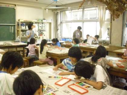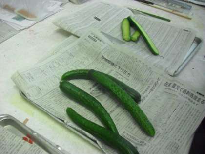 ペンギン図工室で「きゅうり」を描きました。「量感画」ということでどうするのかと思いましたら、特殊なクレヨンのような画材を寝かしてかいたり、たててかいたり、色を混ぜたり、はたまた指でこすって色をのばしたりしてかくのでした。素敵なきゅうりがたくさん描けました。
