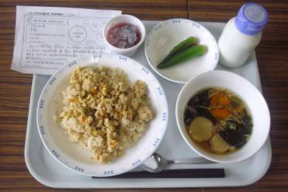 明後日7月7日は七夕です。そこで今日は、ひと足早い「七夕献立」にしました。そぼろ丼の赤、黄、緑は、笹に飾られる色々な色の短冊を、オクラは、その切り口の形から星を、キラキラゼリーは夜空に耀く天の川をイメージしたものです。
