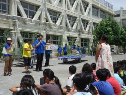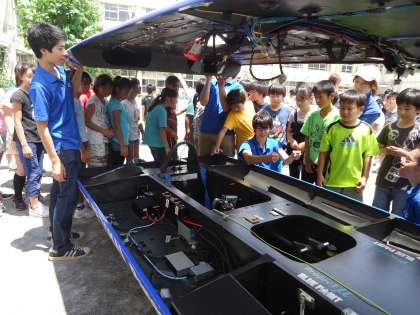 東海大学の木村先生を始め、ソーラーカーを開発するチームの学生が、山野小学校の50周年をお祝いして、出前授業をしてくださいました。木村先生は、本校の卒業生でもあります。在校当時は、第二理科室しかなく、そこで実験器具を触ったエピソードを教えてもらいました。そこでの経験が、ソーラーカーの開発につながっていると思うと、とても夢のあるお話ですね。