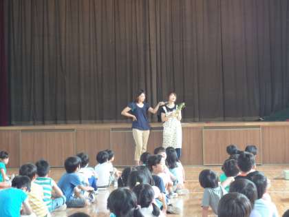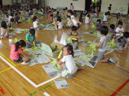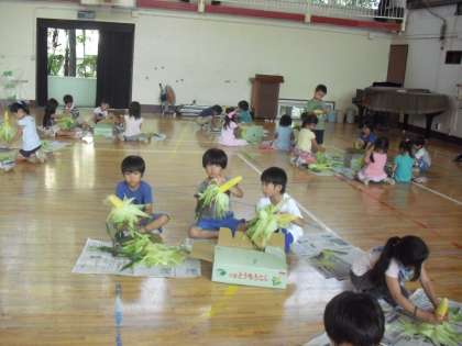 1時間目、体育館にて、食育の授業として、とうもろこしの皮むき体験をしました。