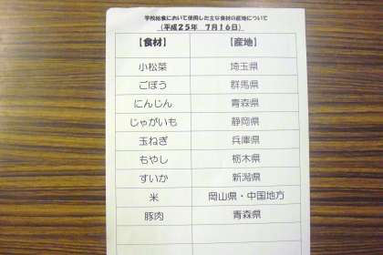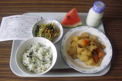 今日は、菜めし、牛乳、五目うま煮、野菜のからしじょうかけ、すいかです。