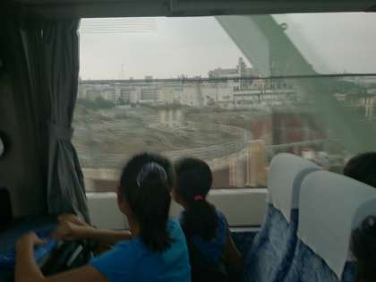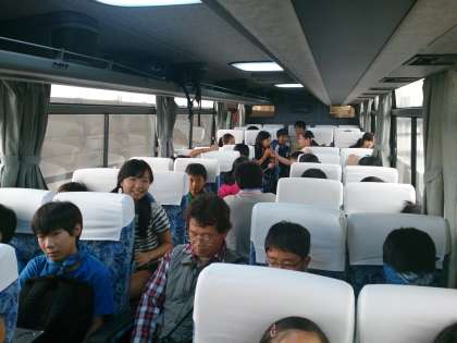 バスレクが始まりました。車窓からは、雲にかすんでいますが、スカイツリーが。順調です。