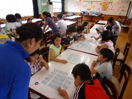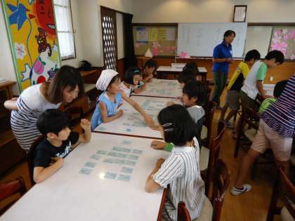 こちらは、近江先生が教えてくれる五色百人一首と俳句かるたの教室です。初めてやる子どもたちにも、とっても丁寧に教えてくれて、すぐに札がとれるようになりました。ベテランの子どもたちは、速い速い!目にもとまらぬ速さです。自治会の皆さんもお手伝いくださいました。ありがとうございます!