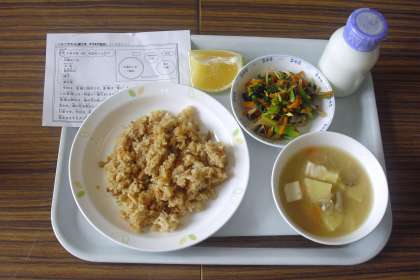 今日は、中華おこわ、牛乳、菊花和え、豚汁、美生柑です。