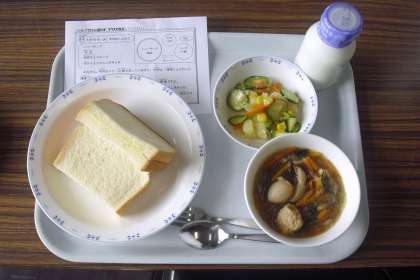 今日は、ハニーサンド、牛乳、肉団子入り春雨スープ、ポテト入りフレンチサラダです。