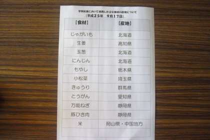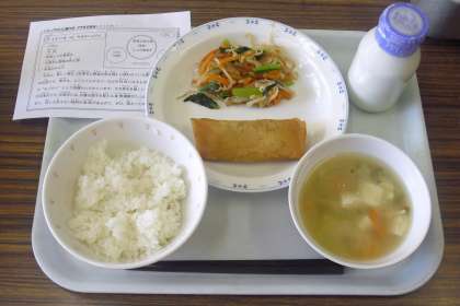 今日は、ごはん、牛乳、和風じゃが春巻き、糸寒天と野菜の和え物、冬瓜のみそ汁です。メモは、新しい献立『糸寒天と野菜の和え物』に使われている“寒天”についてです。