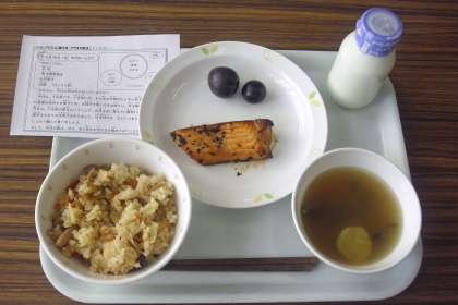 今日は、きのこごはん、牛乳、魚の南部焼き、お月見汁、巨峰です。