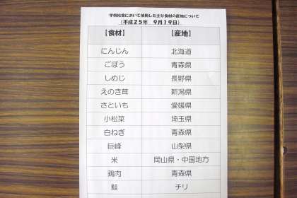 みなさん、今日は、何の日か知っていますか。今日は、十五夜です。十五夜には、その年の作物がたくさん収穫できたことに感謝する気持ちを表すため、お団子や里いもをお供えし、月を眺めます。今日は、十五夜の献立ということで、お月さまに見立てた黄色い白玉団子と里芋を入れてお月見汁を作りました。白玉ダンゴをのどに詰まらせないよう、しっかり噛んで食べましょう。