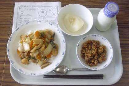 今日は、中華丼、牛乳、大豆とじゃこの甘辛揚げ、梨です。