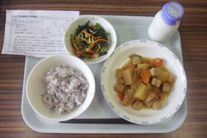 肉じゃがうま煮には、じゃがいもやこんにゃく、さやいんげんなど、色々な食べ物が使われています。これらは、それぞれ鰺が違うことはもちろんですが、食感も全く違います。食感がちがうものを組み合わせるということも、料理のおいしさにつながる大事なポイントなのです。今日は、それぞれの食べ物をよく噛んで、その食感の違いを感じてみてください。