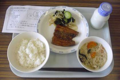 今日は、ごはん、牛乳、さんまのかば焼き風、わかめの酢の物、そうめん汁です。